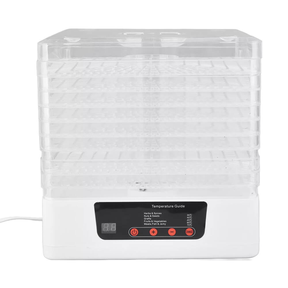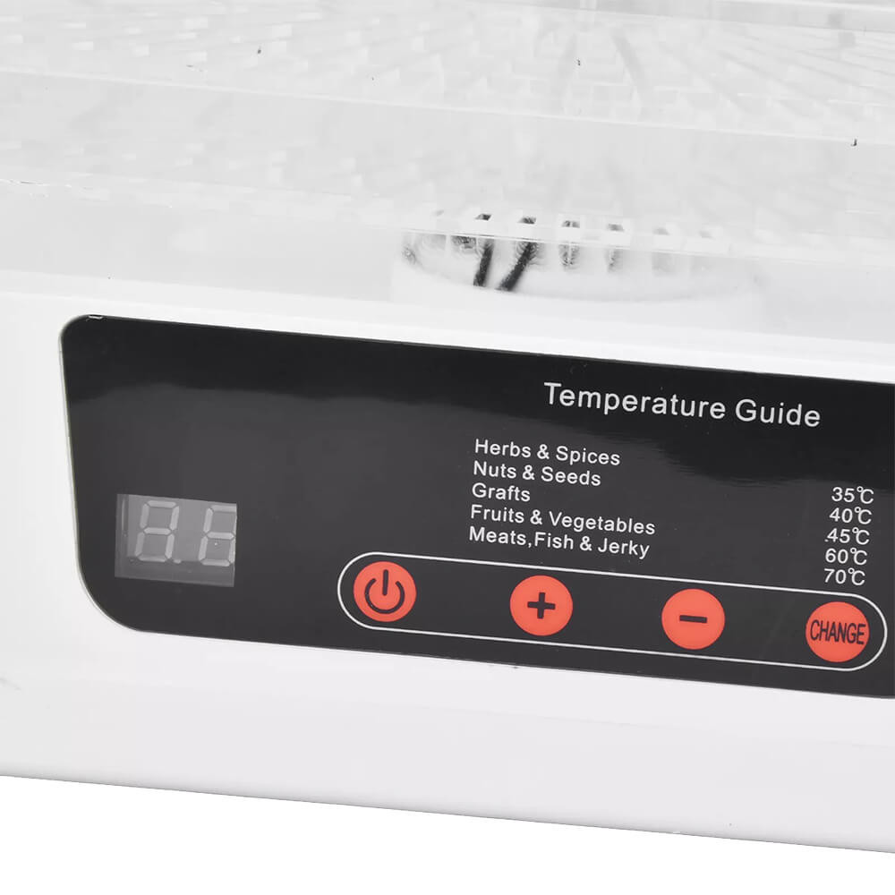 Az érintőpaneles LCD kijelzőn keresztül gyorsan beállíthatod a kívánt hőmérsékletet, így az aszalás mindig pontos és egyenletes lesz. Kompakt mérete miatt kis konyhákban is elfér, átlátszó tálcái pedig lehetővé teszik a folyamat követését.