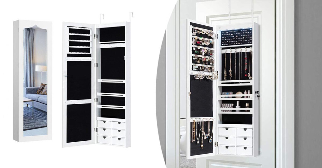 A szekrény belsejében külön rekeszek találhatók gyűrűk, karkötők, fülbevalók és egyéb kiegészítők számára, míg az állítható akasztók lehetővé teszik a nyakláncok praktikus elhelyezését. A kulccsal zárható ajtó biztosítja az értékesebb ékszerek védelmét.