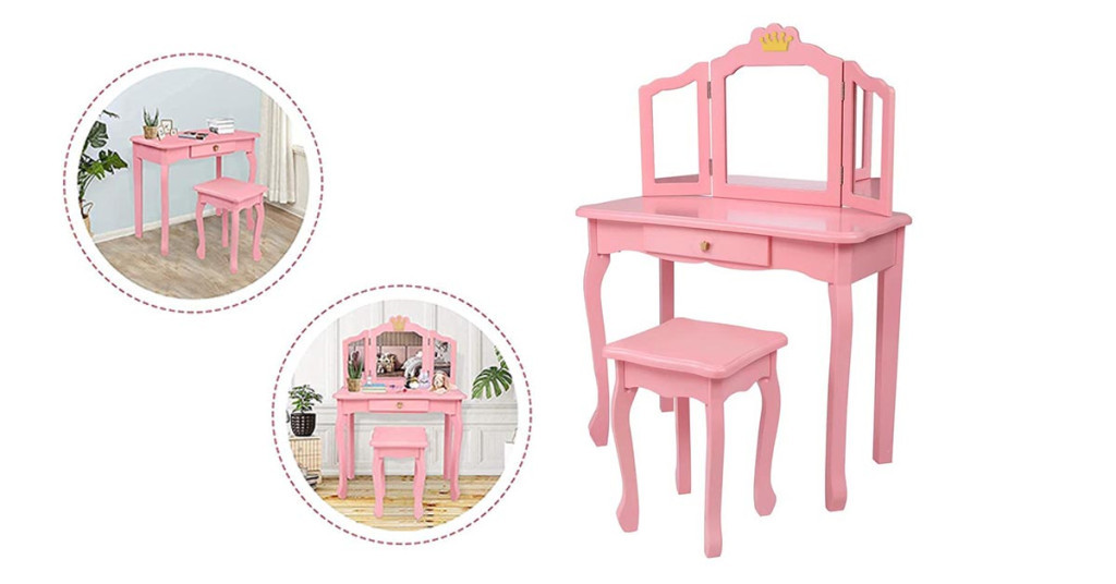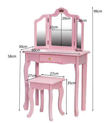Az asztal és a hozzá tartozó szék méretezése gyerekekhez igazított, így a kicsik kényelmesen ülhetnek le elé, hogy elmerüljenek a napi „szépítkezésben”. A három részből álló tükör szárnyai könnyen behajthatók, így biztonságos és praktikus is.