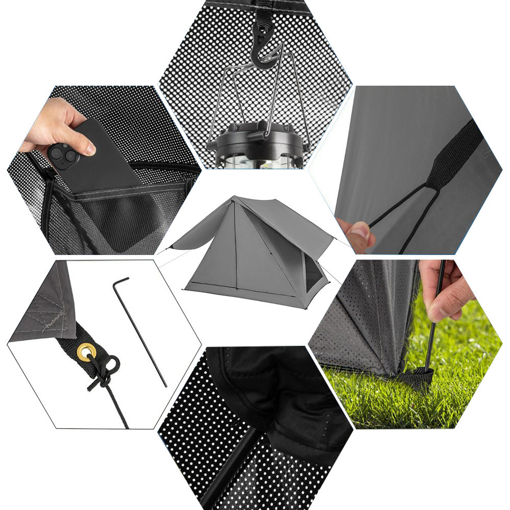 A sátor két nagyméretű, feltekerhető hálós ajtóval és két oldalsó szúnyoghálós ablakkal rendelkezik, így biztosított a folyamatos légáramlás, miközben távol tartja a rovarokat. A kétszeres cipzáras ajtók könnyű be- és kijutást tesznek lehetővé bármelyik oldalról.