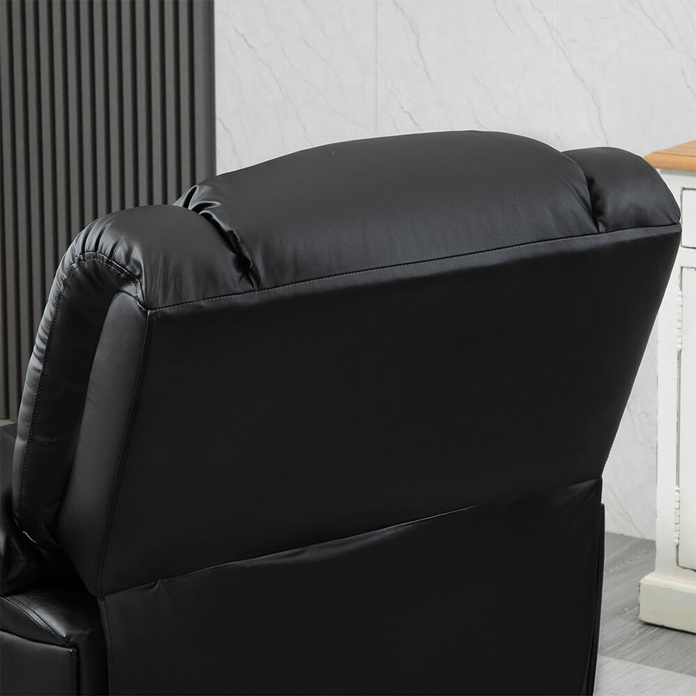 A fotel fekete műbőr kárpitja stílusos megjelenést kölcsönöz bármely nappalinak, ráadásul könnyen tisztán tartható. A karfákban található pohártartók és az oldalsó zsebek extra kényelmet nyújtanak – tökéletes hely a kedvenc könyvednek, magazinodnak vagy a TV távirányítónak.